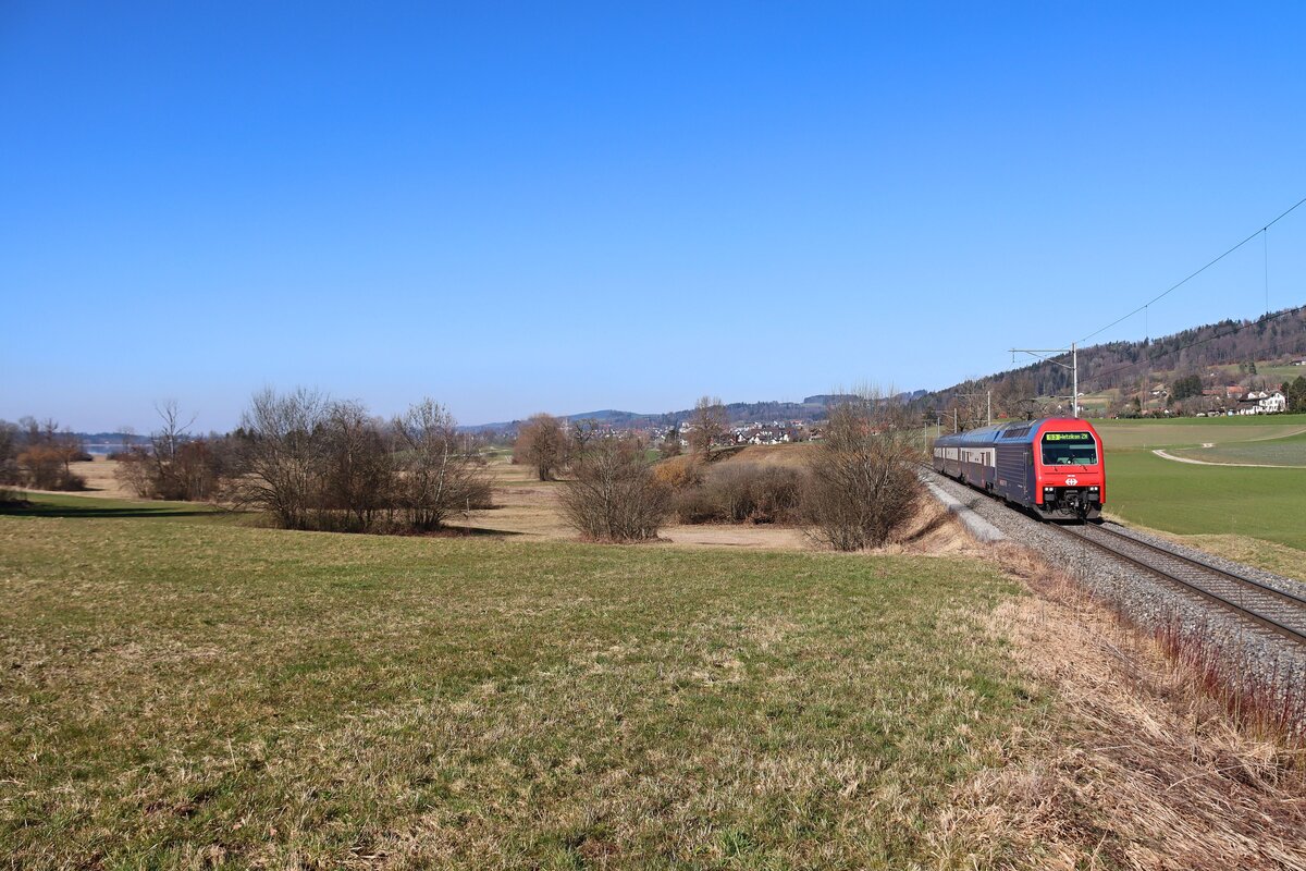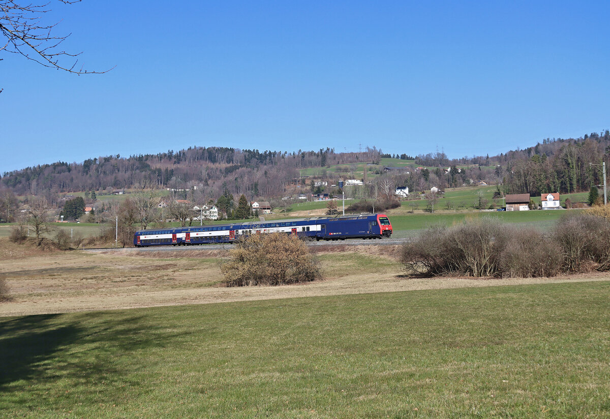 Die Kempttalbahn: Ein S-Bahnzug der S3 (Wetzikon - Zürich Hardbrücke) mit Lok 450 053 am Schluss zwischen Kempten und Pfäffikon ZH. 5.März 2025