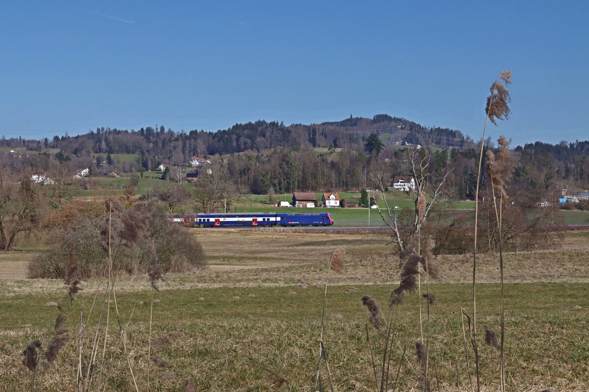 Die Kempttalbahn: Lok 450 090 mit einem Doppelstockwagen DPZ Plus Serie 26-73, aus dem Schilf- und Sumpfgürtel um den Päffikersee aufgenommen. 5.März 2025