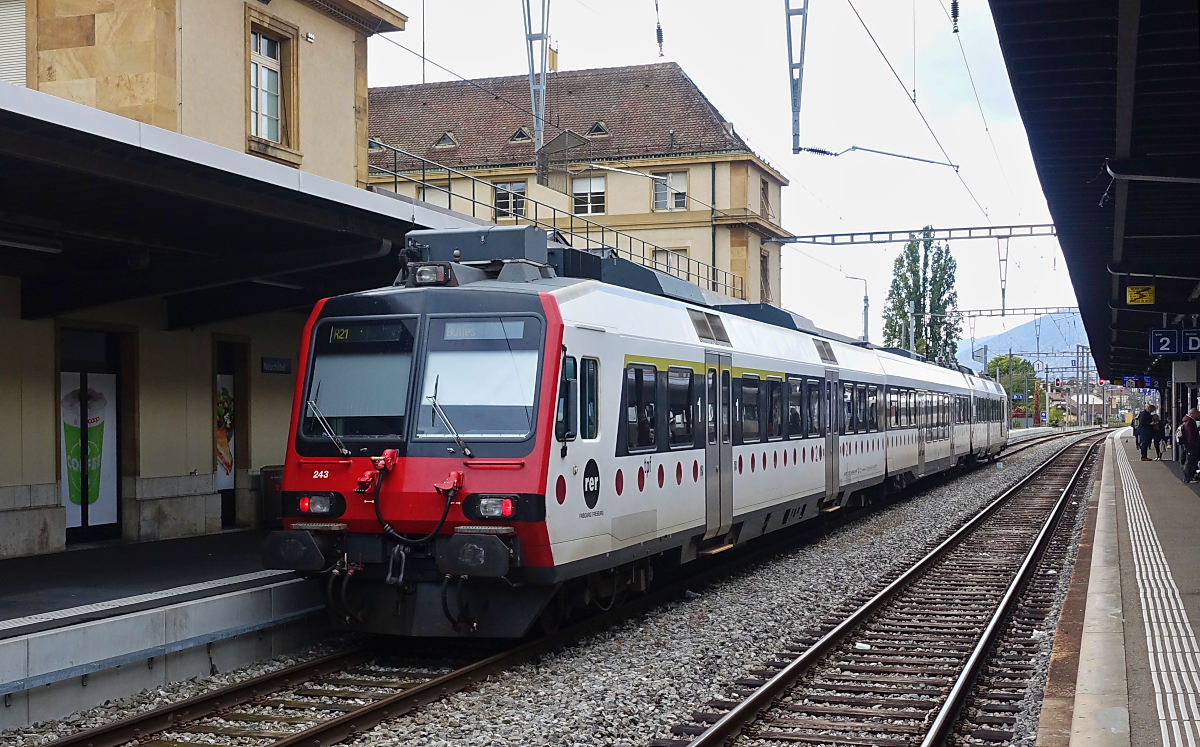 Als R 21 nach Bulles steht der TPF-RBDe 560 243 am 05.10.2025 abfahrbereit im Bahnhof Neuchatel