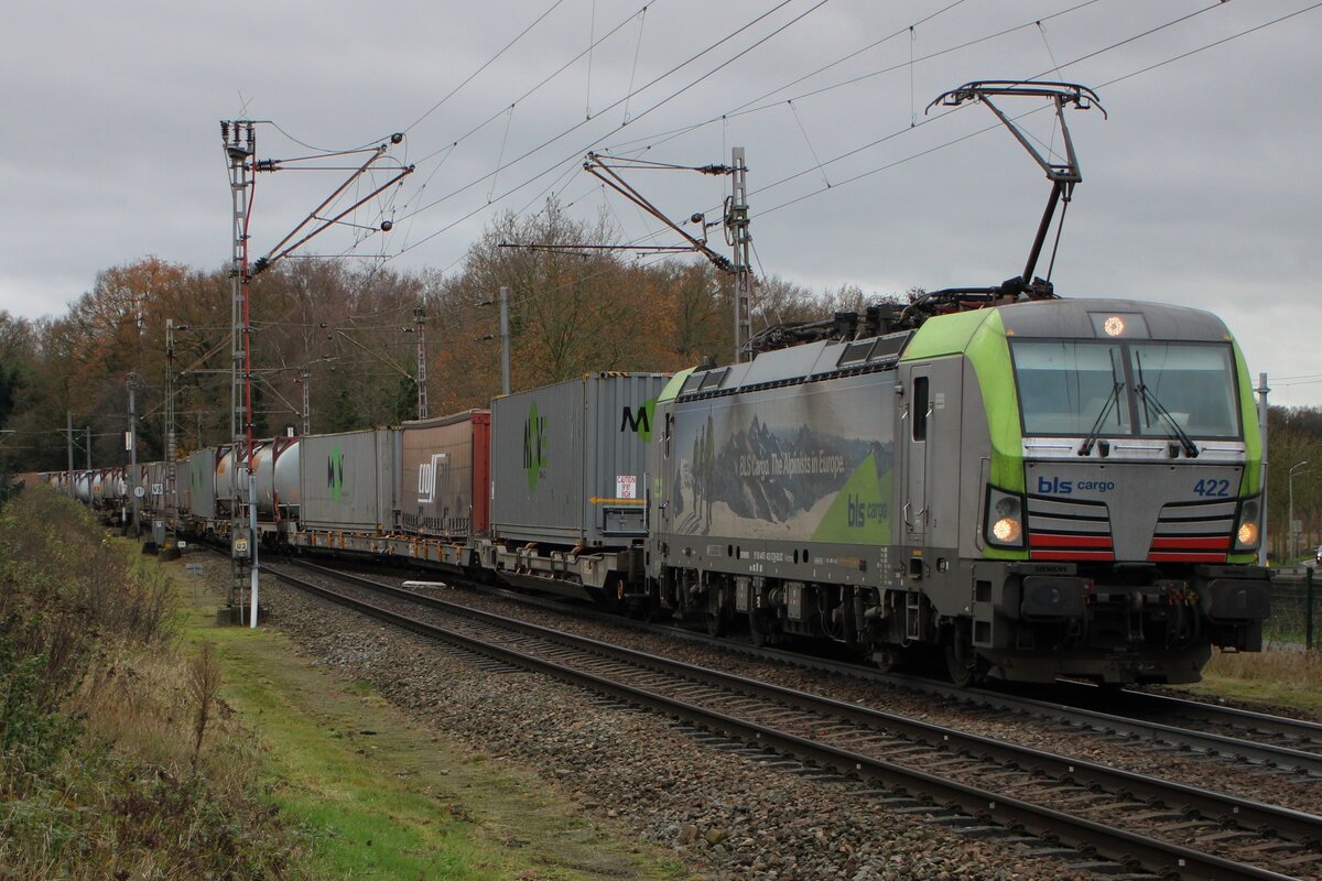 Am 6 Dezember 2025 treft BLS 475 408 mit ein KLV in Venlo ein und passiert der Bahnübergang und beliebter Fotopunkt Vierpaardjes.
