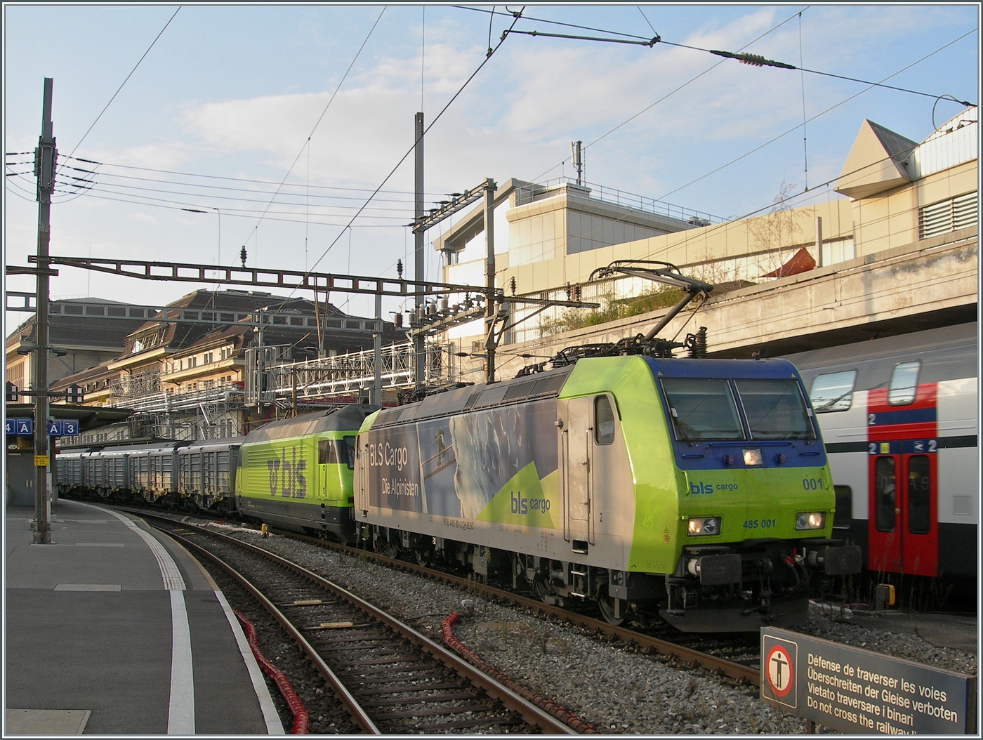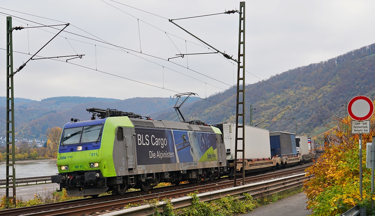 Die Reihe 485 der BLS Cargo ist häufig auf der Rheintalbahn unterwegs, hier ist es die 485 011-1, die am 07.08.2015 den Bahnhof Müllheim/Baden durchfährt