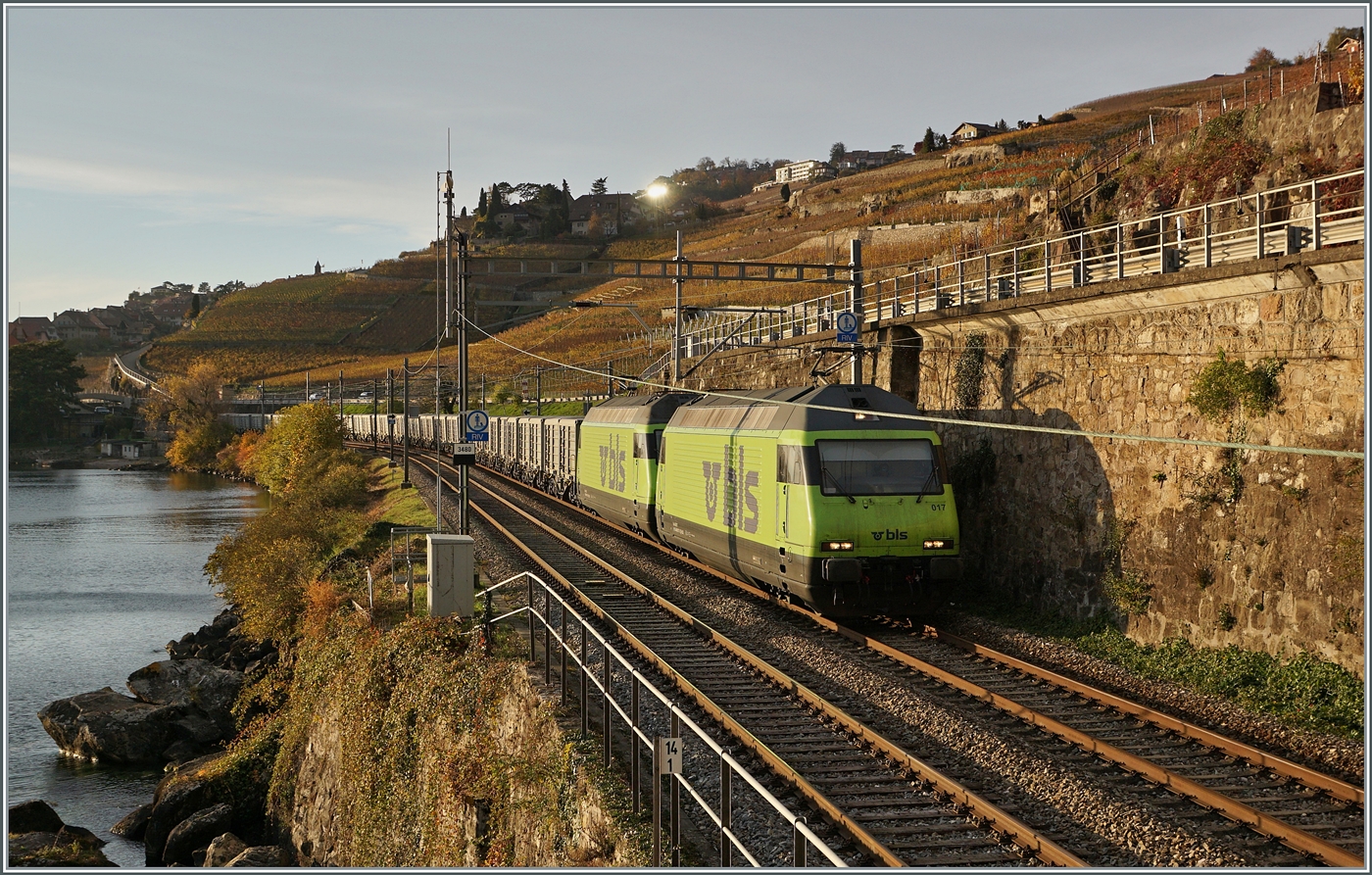 Die BLS Re 465 017 und eine weitere sind mit einem (leeren) Zuckerrübenzug zwischen Rivaz und St-Saphorin in Richtung Chablais unterwegs. 12. Nov. 2024