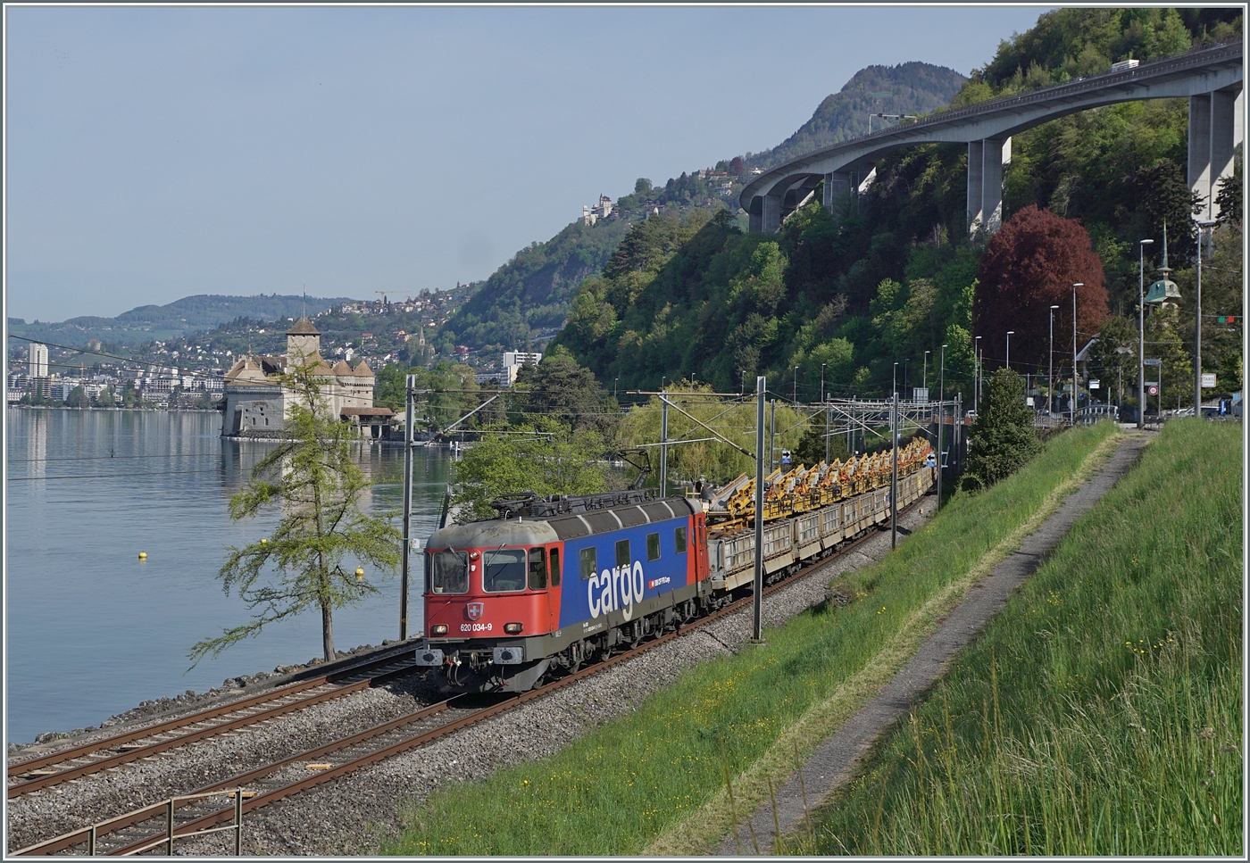 Es die Aussicht vom Bahnhof Chamby auf den Genfersee. Hinten der Port du Basset – Montreux und die Insel Salagnon (auch als „Schwaneninsel“ bekannt).