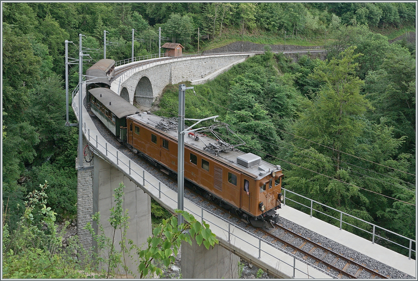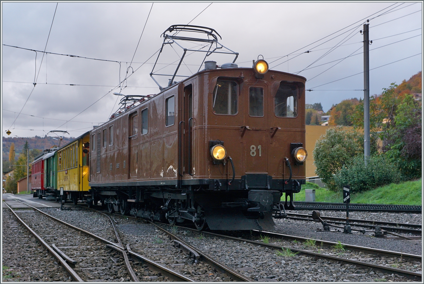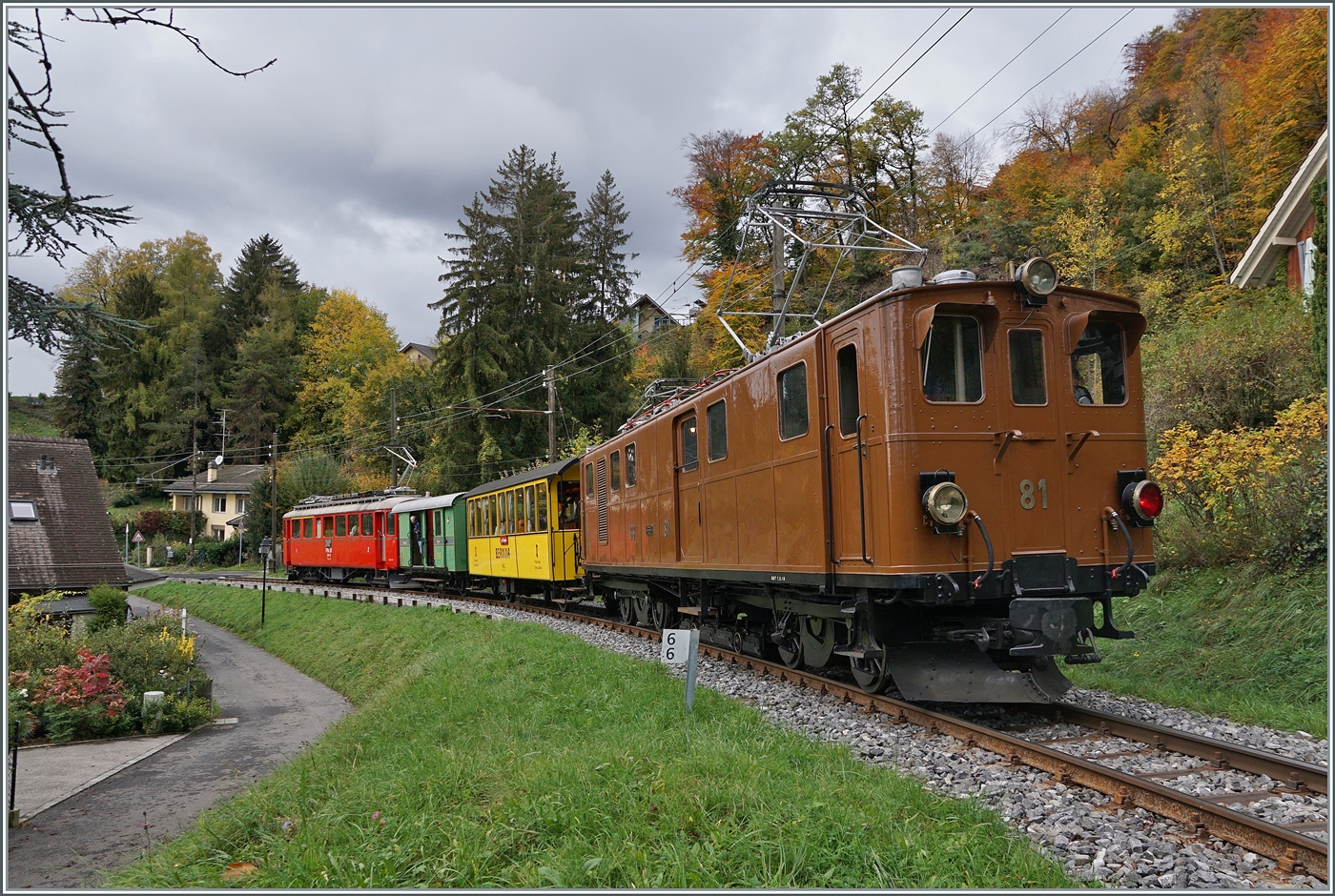 Die Blonay Chamby Bernina Bahn Ge 4/4 81 bei der Rückfahrt nach Blonay mit ihrem "Riviera Belle Epoque" fährt in St-Légier Gare durch. Trotz grundlegendem Umbau der Station St-Légier Gare steht das Ensemble des schönen grossen Baums sowie des kleinen Stationsgebäude weiterhin an ihren Platz.