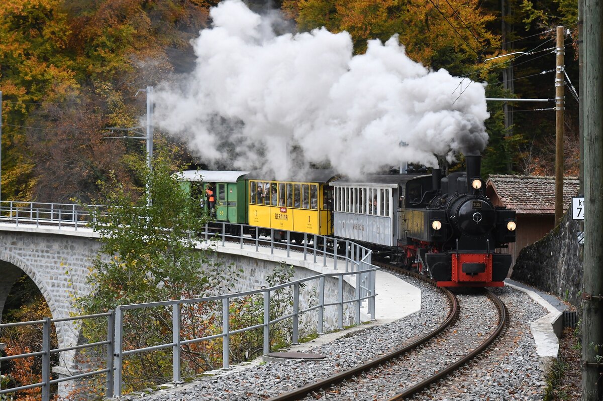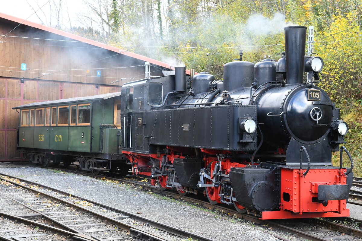Die Blonay-Chamby G 2x 2/2 105 wartet mit dem letzten Dampfzug des Tages in Blonay auf die Abfahrt nach Chaulin.