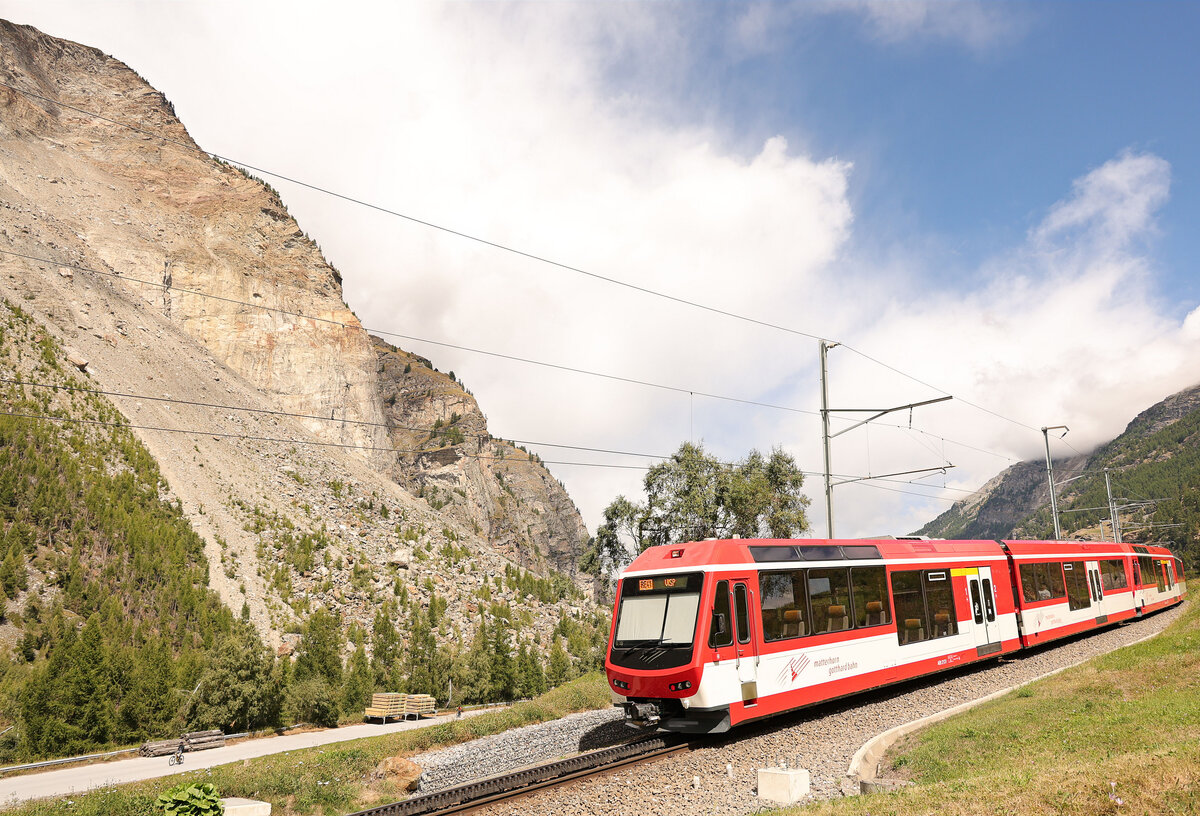 Der Bergsturz von Randa: Aufstieg im Abstieg. Talabwärts fahrende Züge müssen nach der Station Randa den steilen Aufstieg zum Scheitelpunkt der Umfahrungsstrecke bewältigen. Im Hintergrund der Bergsturz. Im Bild ein "Komet"-Zug, dessen hinterster Wagen der Doppelsteuerwagen ABt 2131 ist. Durch die Einheitlichkeit des Designs der Komet-Züge sieht man kaum, dass es sich um einen separaten Doppelwagen handelt. 30.August 2025