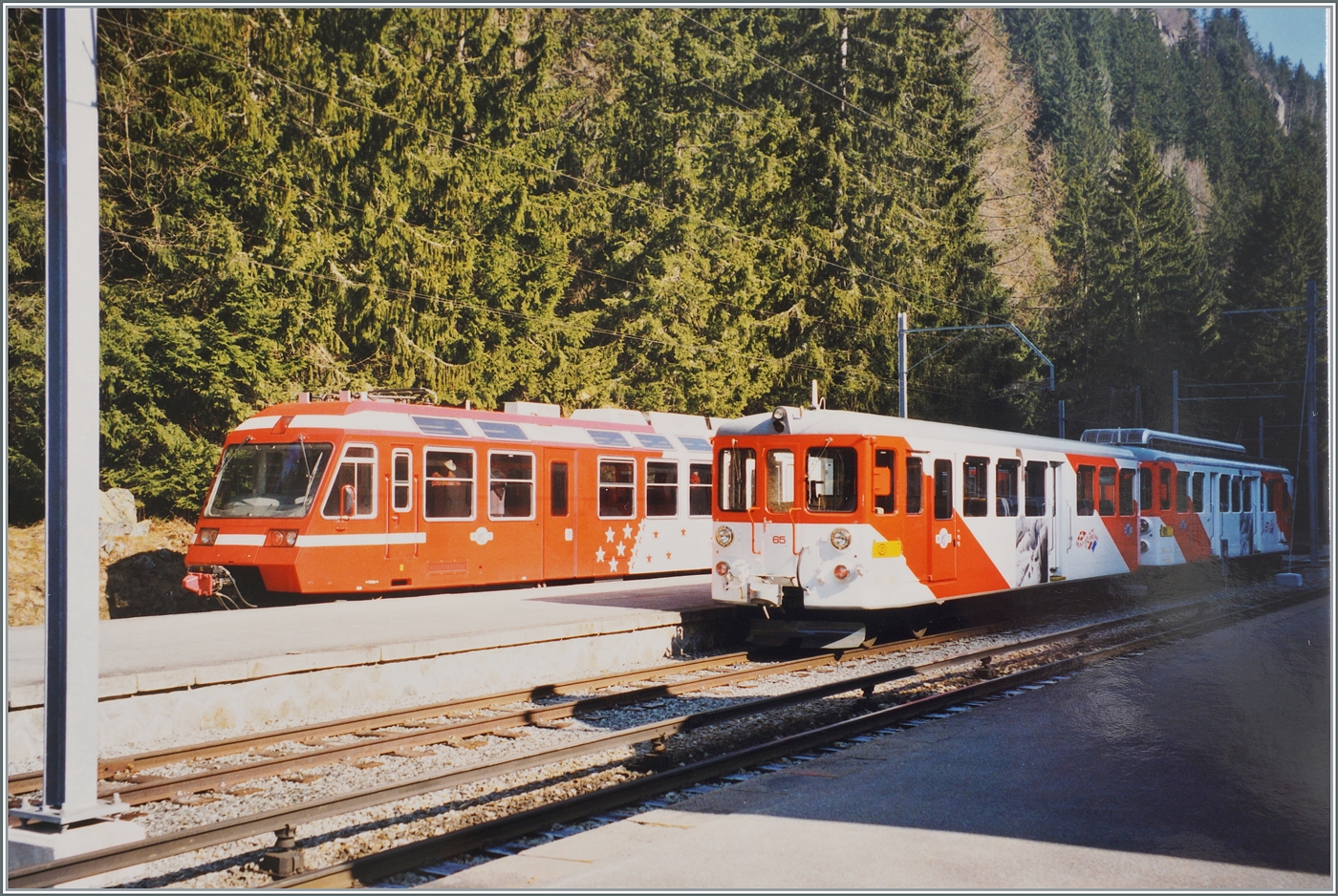 Châtelard Frontiere mit dem SNCF Z 803 aus Richtung von Vallorcine eingetroffen im Hintergrund und dem abgestellten M-C Zug mit dem noch in der Sonne stehenden Bt 65. Der Bahnhof ist bereits mit der Fahrleitung überspannt und dürfte zu diesem Zeitpunkt auch schon den M-C Zügen benutzt worden sein, während die SNCF Züge sich noch der Stromschien bedienten. Interessanterweise ist diese Stromschien wie das Bild eindrücklich zeit im Gegensatz zu französischen Bahnhöfen nicht mit schützenden Holz- oder Metallblanken versehen, sondern liegt frei neben dem Gleise. Analogbild vom März 1998