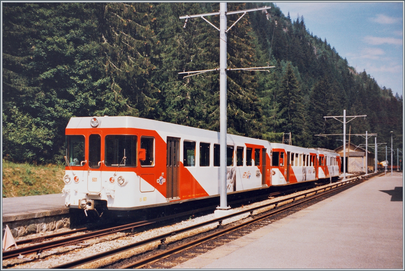 Mit dem Bt 601 und dem Zwischenwagen B 701 erreicht der M-C Einzelgänger BDeh 4/4 501 (Baujahr 1980) von Martigny kommend sein Ziel Châtelard Frontière. Zwar hängt nun die Fahrleitung im Bahnhof von Le Châtelard, doch zum Aufnahmezeitpunkt war sie noch im Bau und somit spannungslos, was erklärt, weshalb der Zug mit gesenktem Stromabnehmer verkehrt. Analogbild vom August 1995