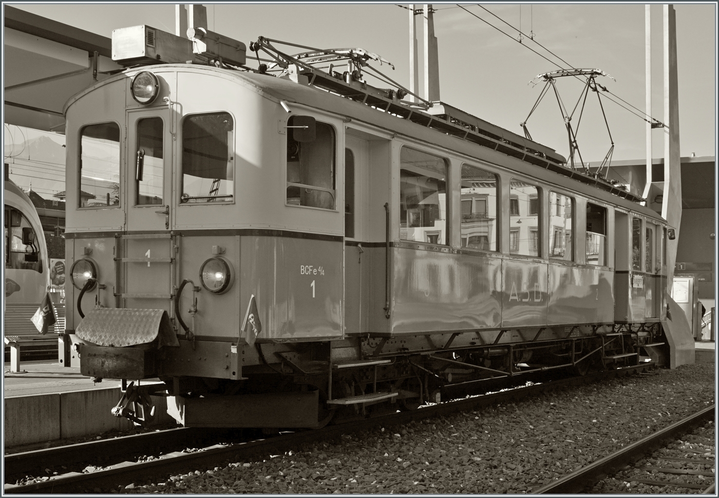 Die Association ASD 1914 bot für den Samstag Nachmittag einen Zug zum Jassen (Kartenspielen) an. Zwar sehe ich den Zweck nicht, im Zug Karten zu spielen, aber es bot sich mir die schöne Gelegenheit, den ASD BCFe 4/4 N° 1 wieder einmal im Einsatz zu sehen und dieses Mal auf der ASD. Da für den Nachmittag Nebel angesagt war, wollte ich den  Jass-Zug  im Bahnhof von Aigle fotografieren, war aber dann etwas enttäuscht, dass er (fototechnisch) ziemlich ungeschickt stand.
