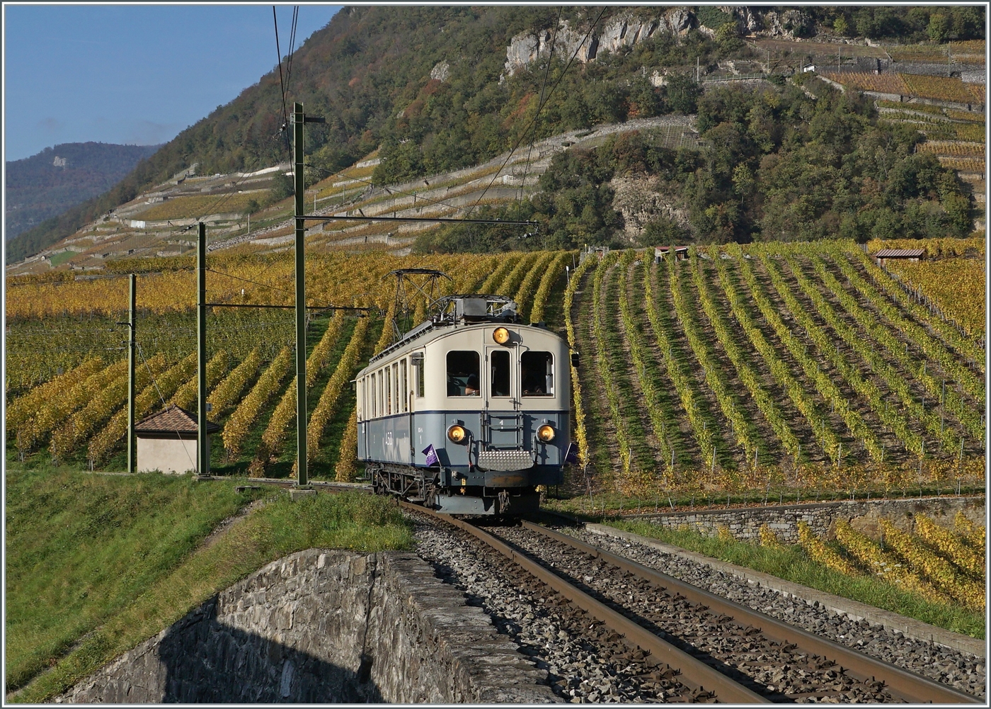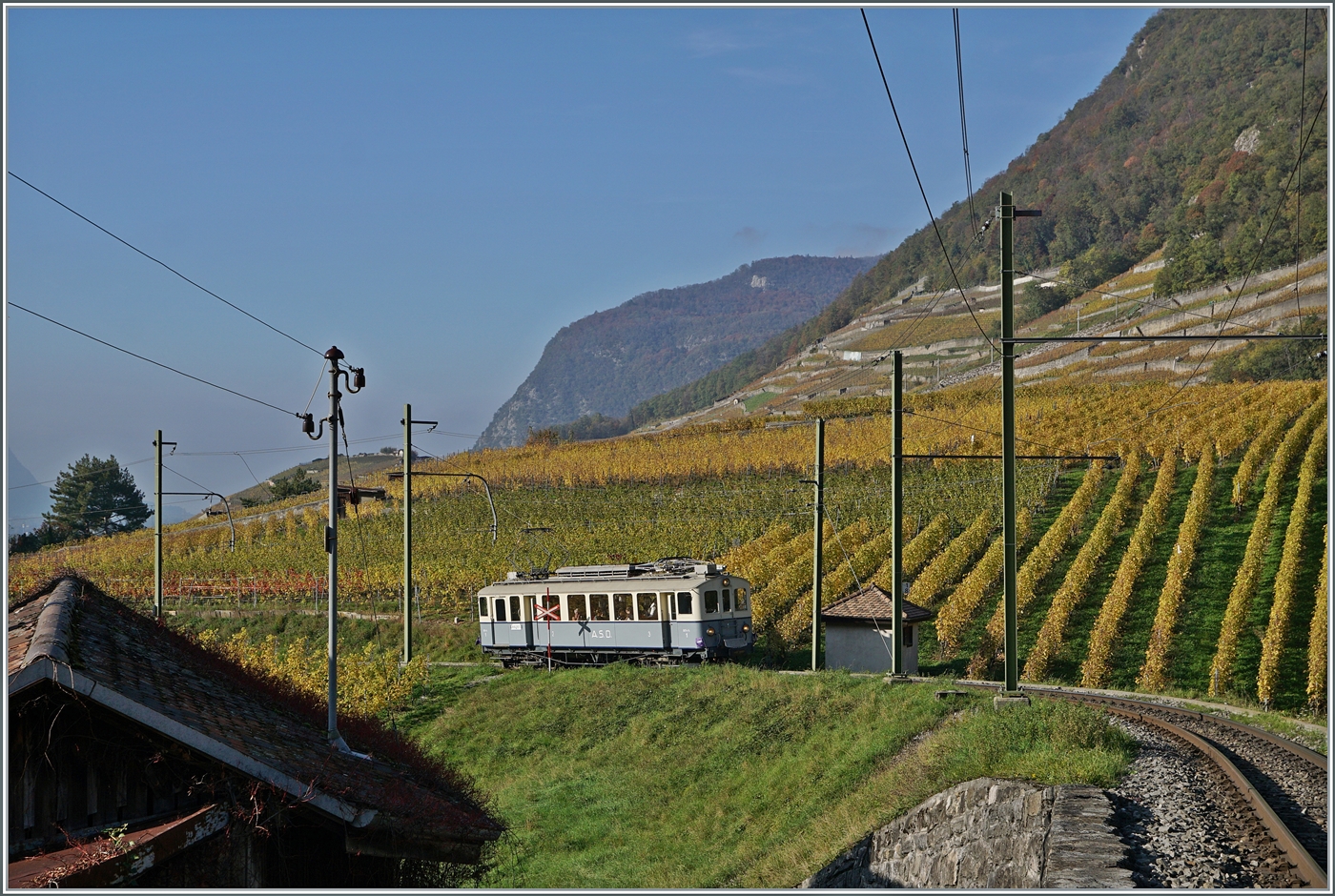 Nachdem ich mich beeilt hatte, an der Strecke eine Fotostelle zu finden, musste ich nicht lange warten, bis der ASD 1914 BCFe 4/4 N° 1 kam und in den herbstlichen Rebbergen ein gutes Bild abgab.