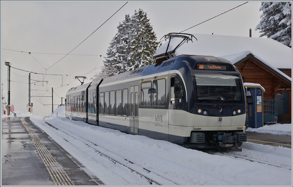Der CEV MVR ABeh 2/6 7508 erreicht als R35 die frisch verschneite Gipfelstation Les Pléiades auf 1348 müM.