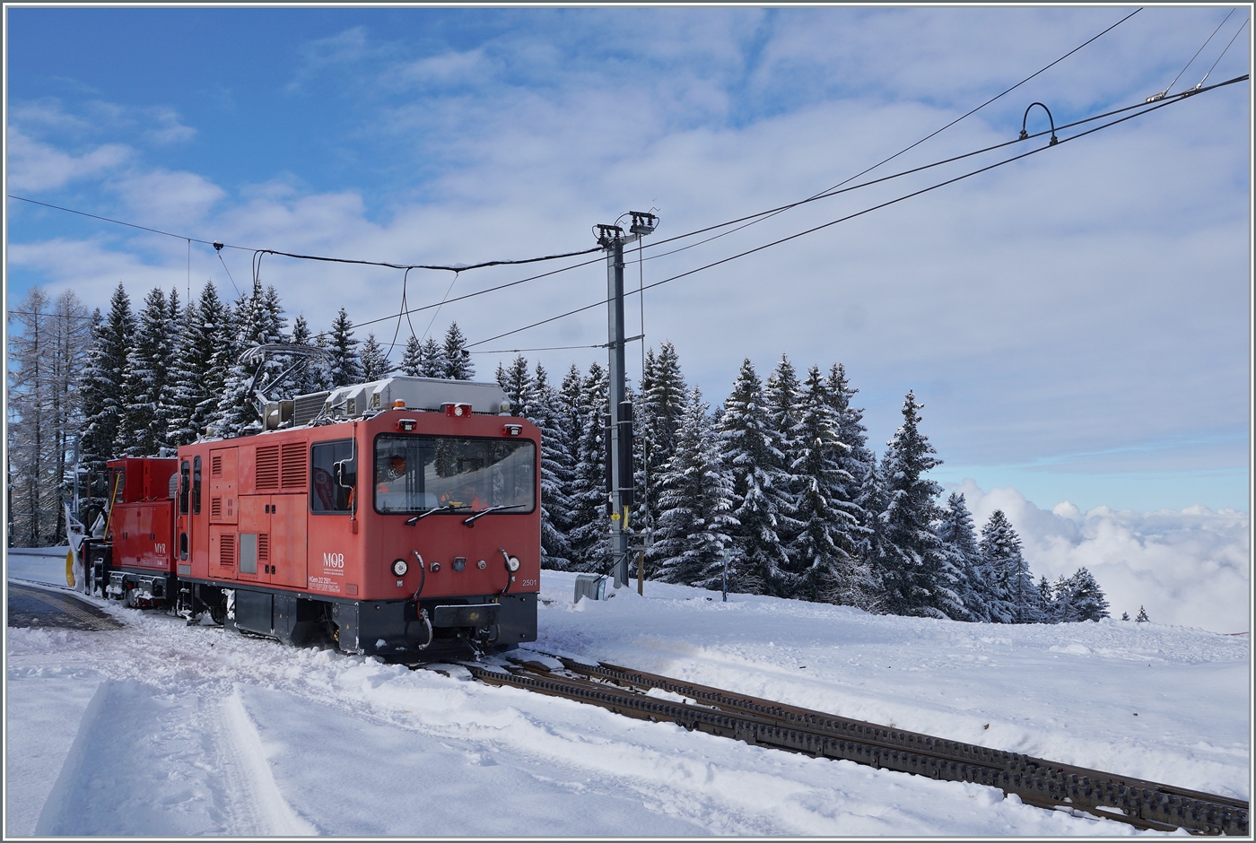 Es hat geschneit und da muss, wie üblich, die HGem 2/2 2501 mit dem X464 zur Schneeräumung auf den Les Pléiades ausrücken. Das Bild zeigt die HGem 2/2 2501 nach getaner Arbeit beim Verlassen der Gipfelstation Les Pléiades in Richtung Blonay fahrend. Im rechten Bildteil öffnet sich der Blick auf des Nebelbedeckte Mittelland, wobei der Nebel sich in der Folge auch in den Bergen ausbreitete.