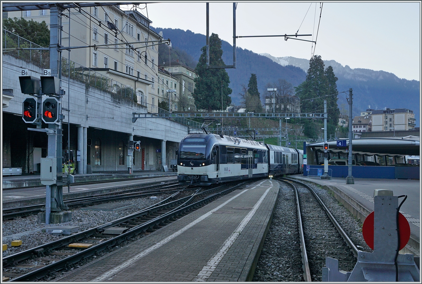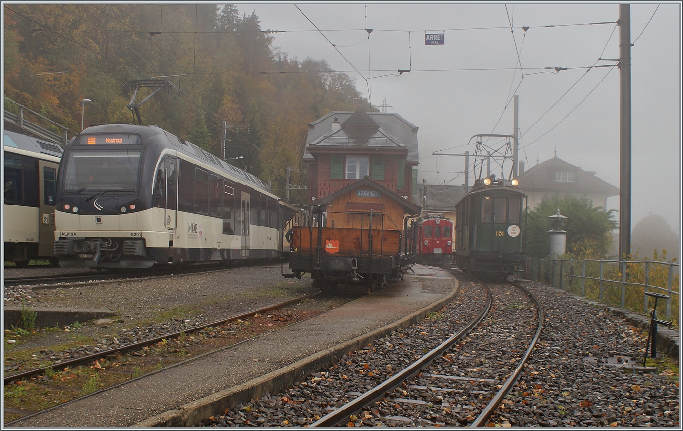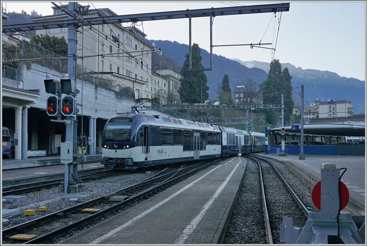 Zwei MOB Alpina Triebwagen (ABe 4/4 und Be 4/4 Serie 9000) sind mit zwei Zwischenwagen als Regionalzug von Zweisimmen nach Montreux unterwegs und halten in Saanen.