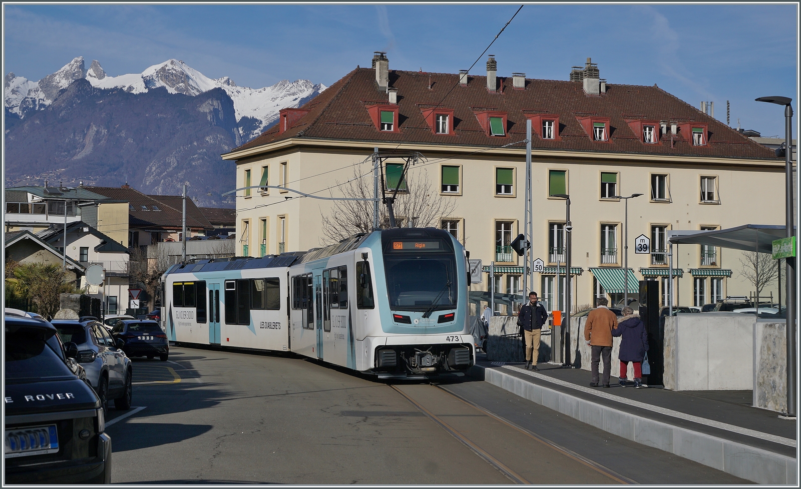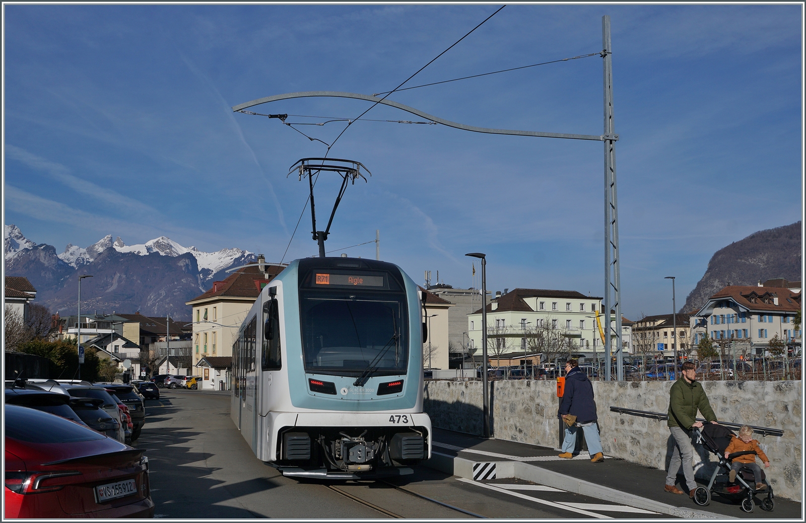 Der TPC ASD ABe 4/8 473 ist als R71 von Les Diablerets nach Aigle unterwegs und hält kurz in Aigle Place du Marché. Die Haltestelle ist nun mit einem Bahnsteig versehen worden und befindet sich gut 50 Meter nördlicher der  alten  Haltestelle. Zudem wurden wie bereits erwähnt neue, den alten sehr gut nachempfundene Fahrleitungsmasten aufgestellt. 9. Februar 2026