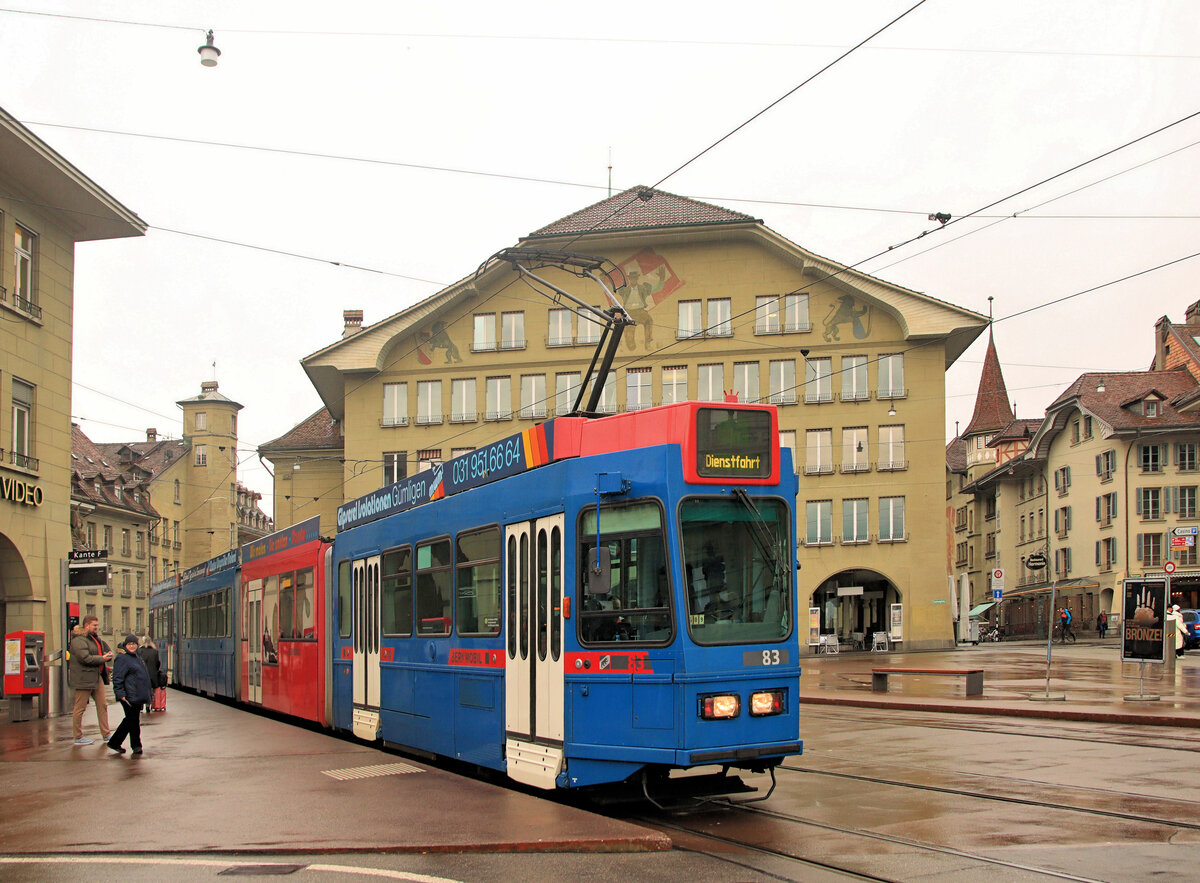 Neben 2 planmässigen Berner Tramwagen wird die Ueberlandstrecke von Bern via Muri nach Worb (Linie 6) von RBS Be 4/10 bedient, die 2010 ein viertes Glied (rot gestrichen) mit Niederflurbereich bekamen. Hier Wagen 82 im Aufstieg von Worb nach Langenloh. 2.Dezember 2020