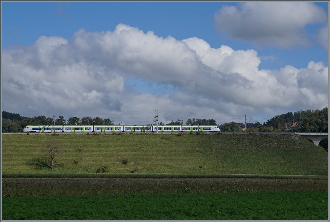 BLS: BLS Regionalzug mit einem RBDe 565 Triebzug beim Passieren des Gümmenen Viadukts am 7. Mai 2016.