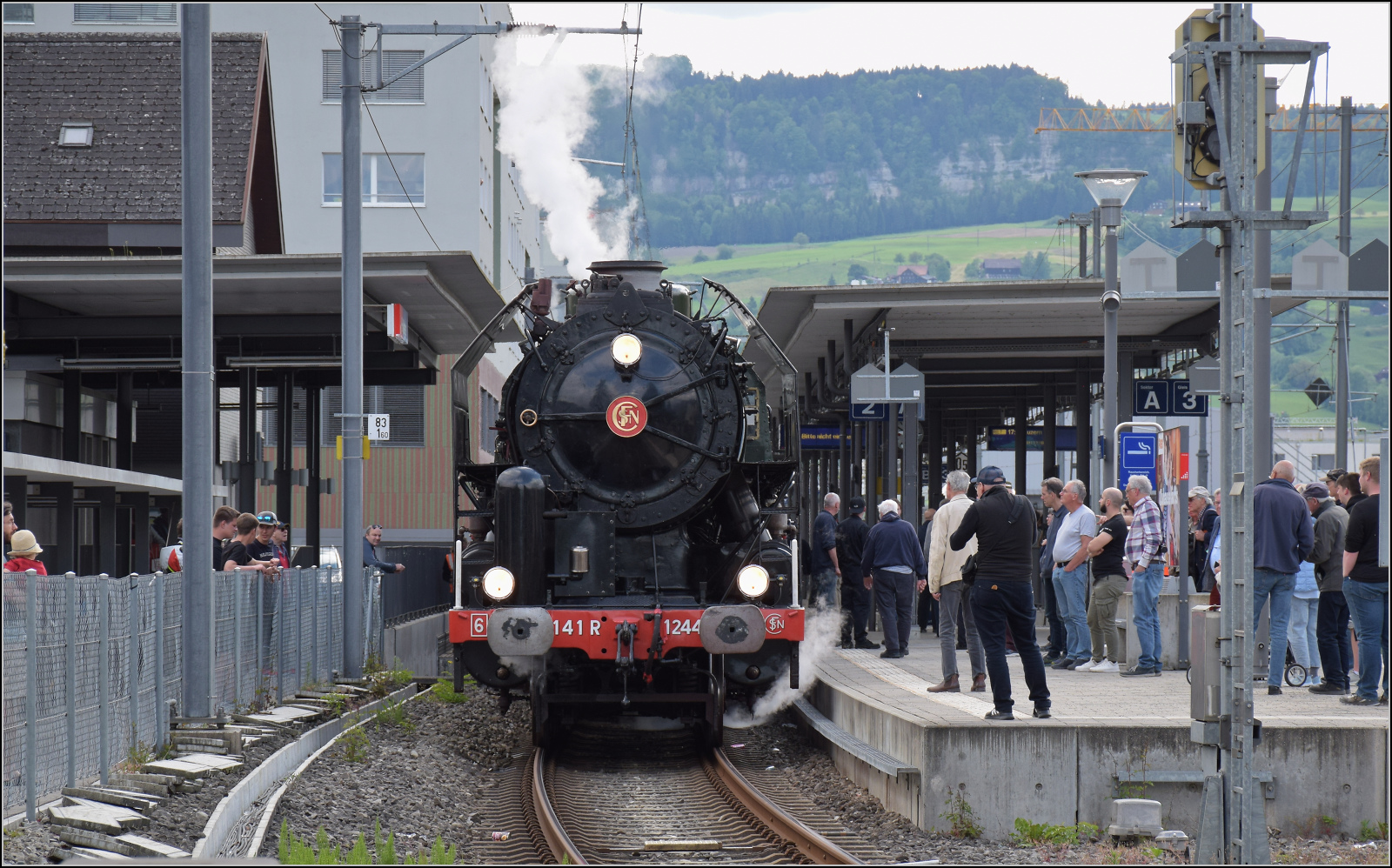 Warten auf die Dampfloks. RABe 528 222 und RABe 528 205 auf dem Weg nach Bern. Dabei wird klar, dieser Fotostandort hat zwar ein wunderbares Panorama, ist aber für die Kamera Höchststrafe. Allerdings werden alles anderen Fotos von der Sonnenseite mit Wiese im Hintergrund ohnehin gemacht; ein guter Grund, wider jede Vernunft aufs Ganze zu gehen. Tägertschi, Mai 2025.