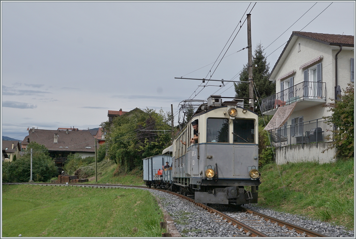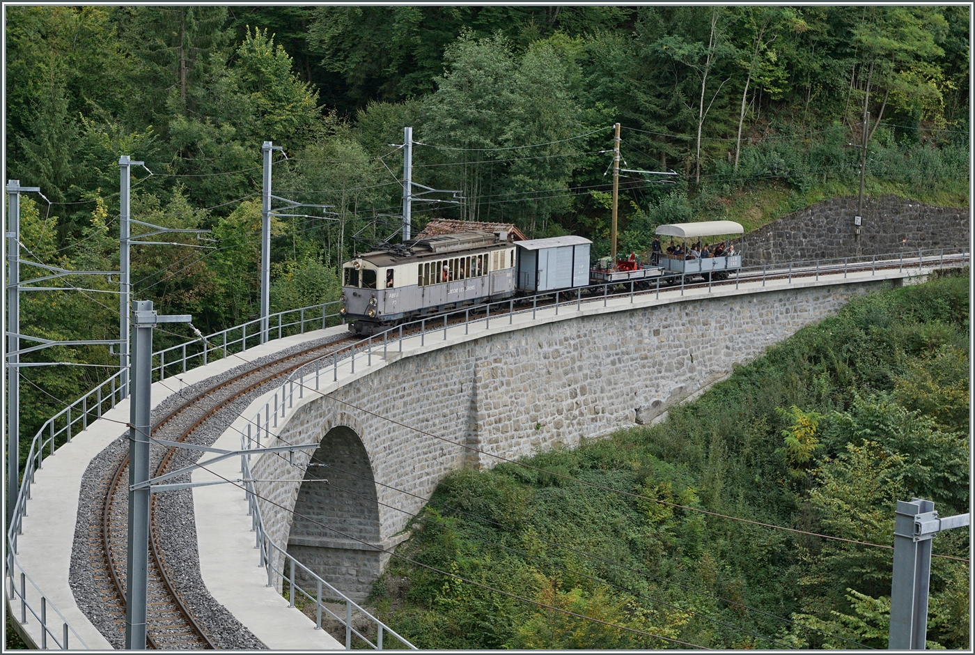 La DER de la Saison 2024! Am Bahnsteig in Blonay steht ein ganz besonderer Zug: "Mon dernier Train - Mein letzter Zug". Sicherheit ist das oberste Gebot der Eisenbahn, dies gilt auch für Museumsbahnen, das "Personal" muss wie, wie die Kollegen der echten Bahn periodischen Prüfungen ablegen. Und so kommt es auch bei einer Museumbahn vor, dass ein Lokführer seine letzte Fahrt absolviert. In diesem Sinne: Alles Gute für die Zukunft und weiterhin viel Freude mit dem wunderschönen Hobby Eisenbahn! Der LLB ABFe 2/4 10 der Blonay-Chamby Bahn wartet in Blonay auf die Abfahrt nach Chaulin. 26. Okt. 2024