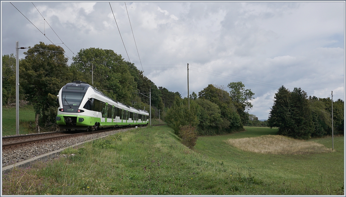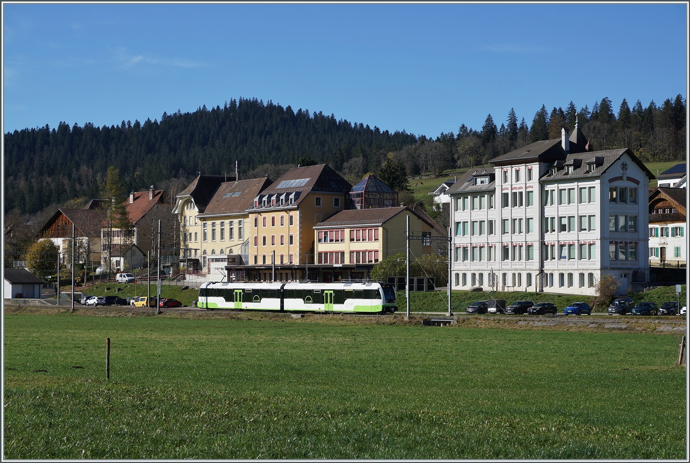 Der transN (ex cm,) BDe 4//4 ist bei Les Coeudres als Regionalzug R 22 316 auf dem Weg nach Les Pont de Martel. Diese Leistung ist eigentlich (praktisch) die Leerfahrt des Schülerzugs R 22 317 nach La Corbatières, die aber im Fahrplan publiziert ist und genzutzt werden kann.