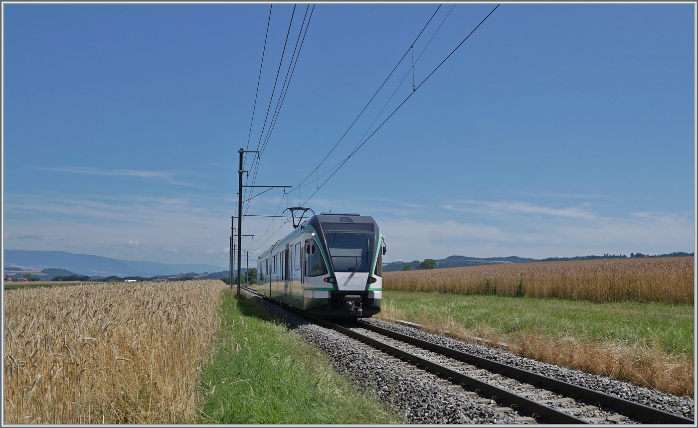 Der RBe 4/8 49 und LEB Be 4/8 35 "Romanel" verlassen die Station Jouxtens-Mézery.