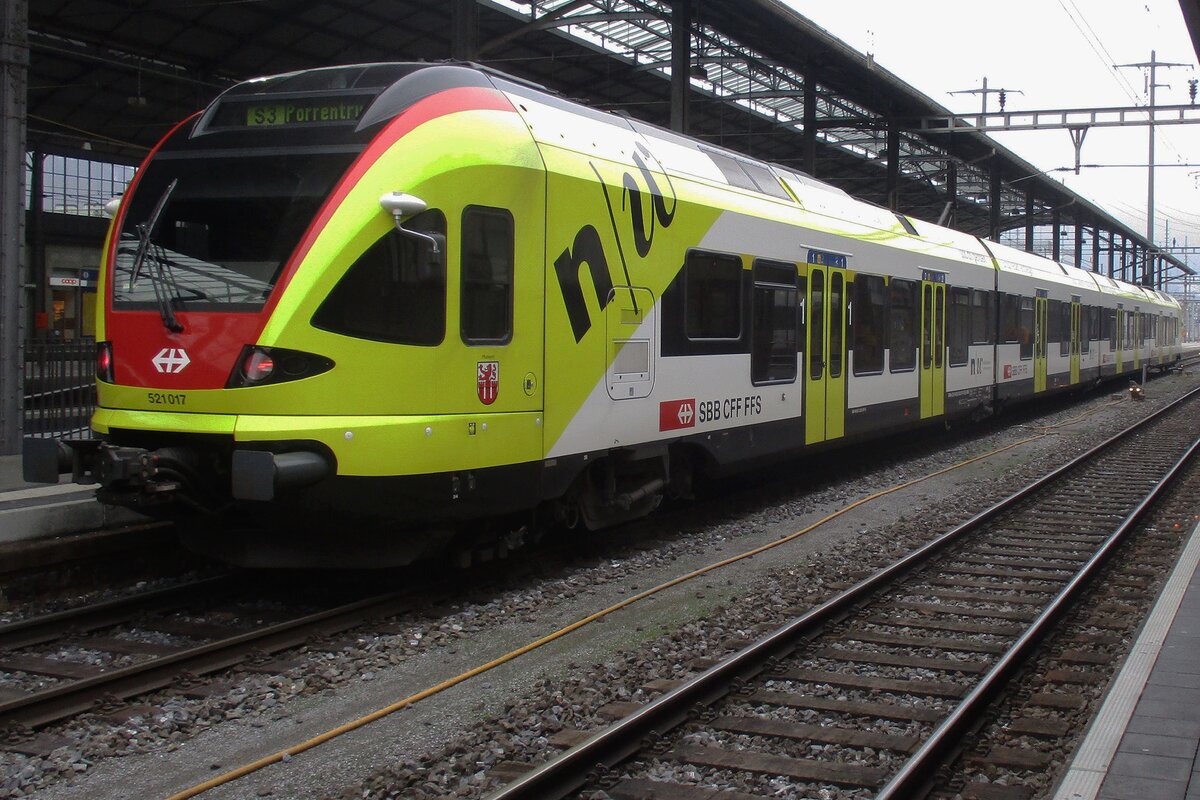 DB/SBB: Zugskreuzung vom 7. August 2015 in Lörrach Museum Burghof zwischen der S 5 Steinen-Weil am Rhein mit SBB RABe 521 011 FLIRT und dem DB Autozug Hamburg - Lörrach. Der Autozug ist von der Einstellung bedroht wegen rückläufiger Nachfrage.