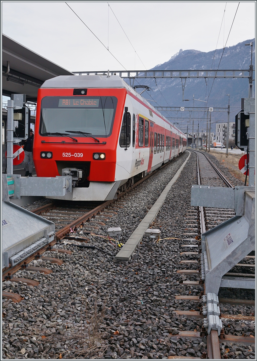Die TMR RABe 525 039 und 252 040 erreichen als R81 26117 von Le Châble ihr Ziel Martigny. Nach einer kurzen Wendezeit von vier Minuten werden die beiden NINA-Triebzüge wieder nach Le Châble zurückfahren. 24. Jan. 2026