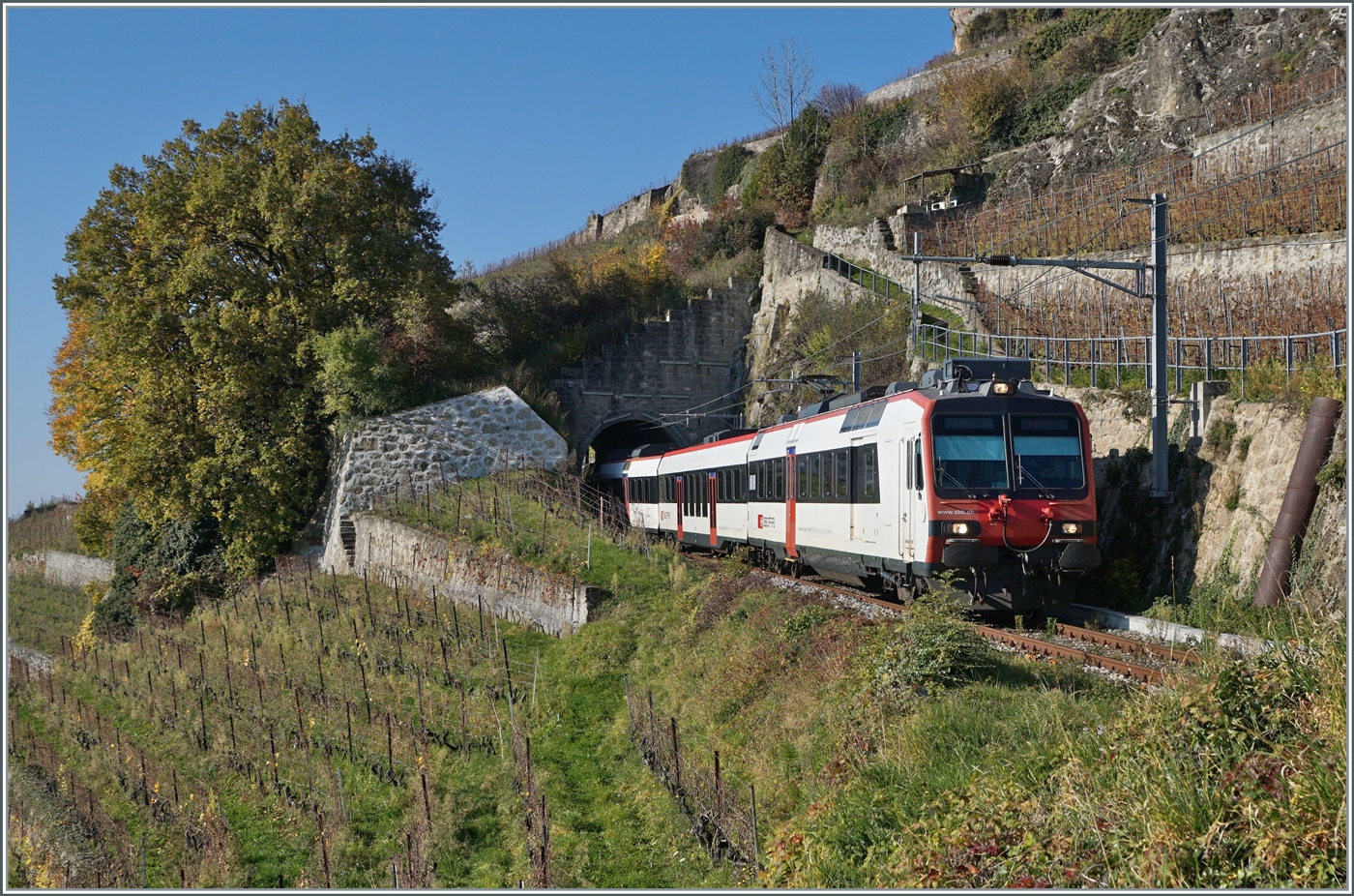 Der SBB RBDe 560 210  Domino  (RBDe 560 DO 94 85 7 210-7 CH-SBB) ist auf der Train de Vignes Strecke auf der Fahrt von Puidoux nach Vevey  und soeben den nur 20 Meter langen Salanfe Tunnel oberhalb von St-Saphorin verlassen.