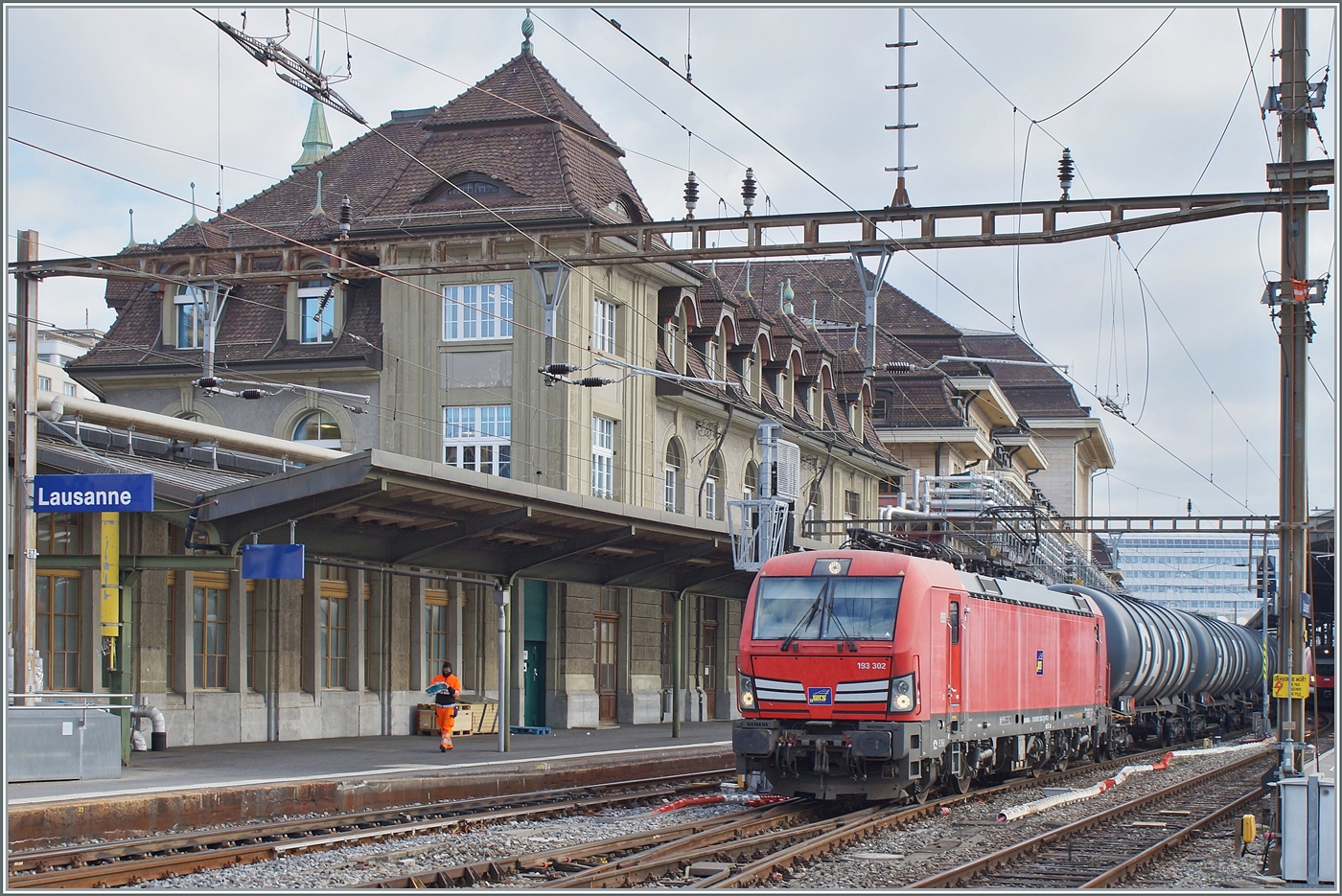 Die (ex DB) WRS 193 302 (91 80 6193 302-7 D-WRSCH) steht mit einem langen Kesselwagenzug in einige Zeit in Lausanne bevor ihre Fahrt weitergeht. Die Lok hat gemäss der Anschrift eine Zulassung in D, A, CH, I, NL und B, wobei praktisch an der selben Stelle angeschriebenen Spannungen für mich nicht schlüssig sind: 3000 V , 1500 V, 1500 V 50 Hz und 1000 V 16,7 Hz. Leider stand die Lok mit ihrem Zug fotografisch gesehen sehr ungeschickt, was hauptsächlich auf die Länge der Zuges zurückzuführen ist.