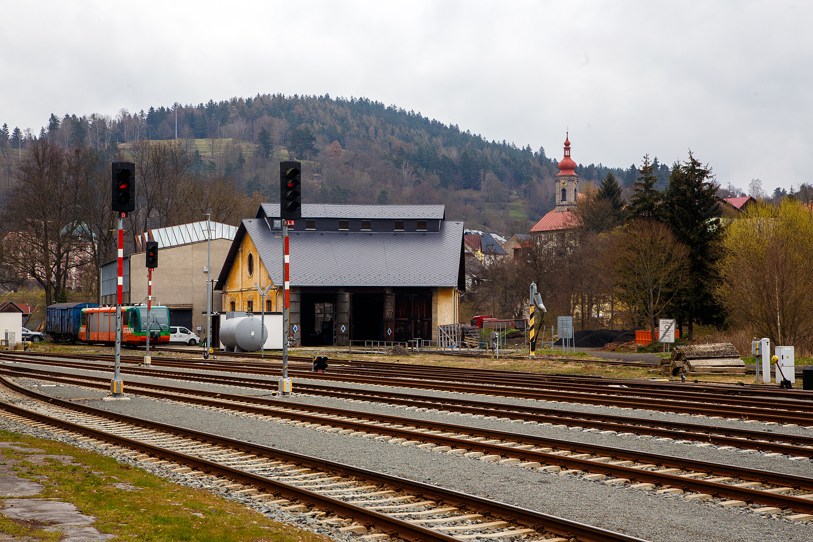 Beim Bahnhof Bečov nad Teplou (Petschau) am 20.04.2023, der Bahnhof ist vom historischen Zentrum des kleinen schönen Ortes etwas entfernt, aber der kurze Fußweg lohn sich.