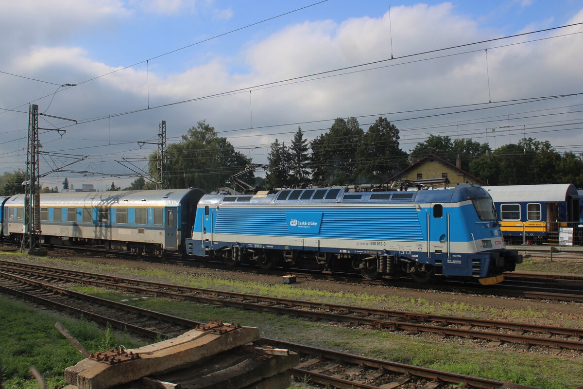 Vom Bahnsteig mit Zom: CD 380 009 zieht ein IC nach Ceske Budejovice durch Benesov u Prahy am 26 September 2025 und wird vom mindestens zehn Bahnfans fotografiert.